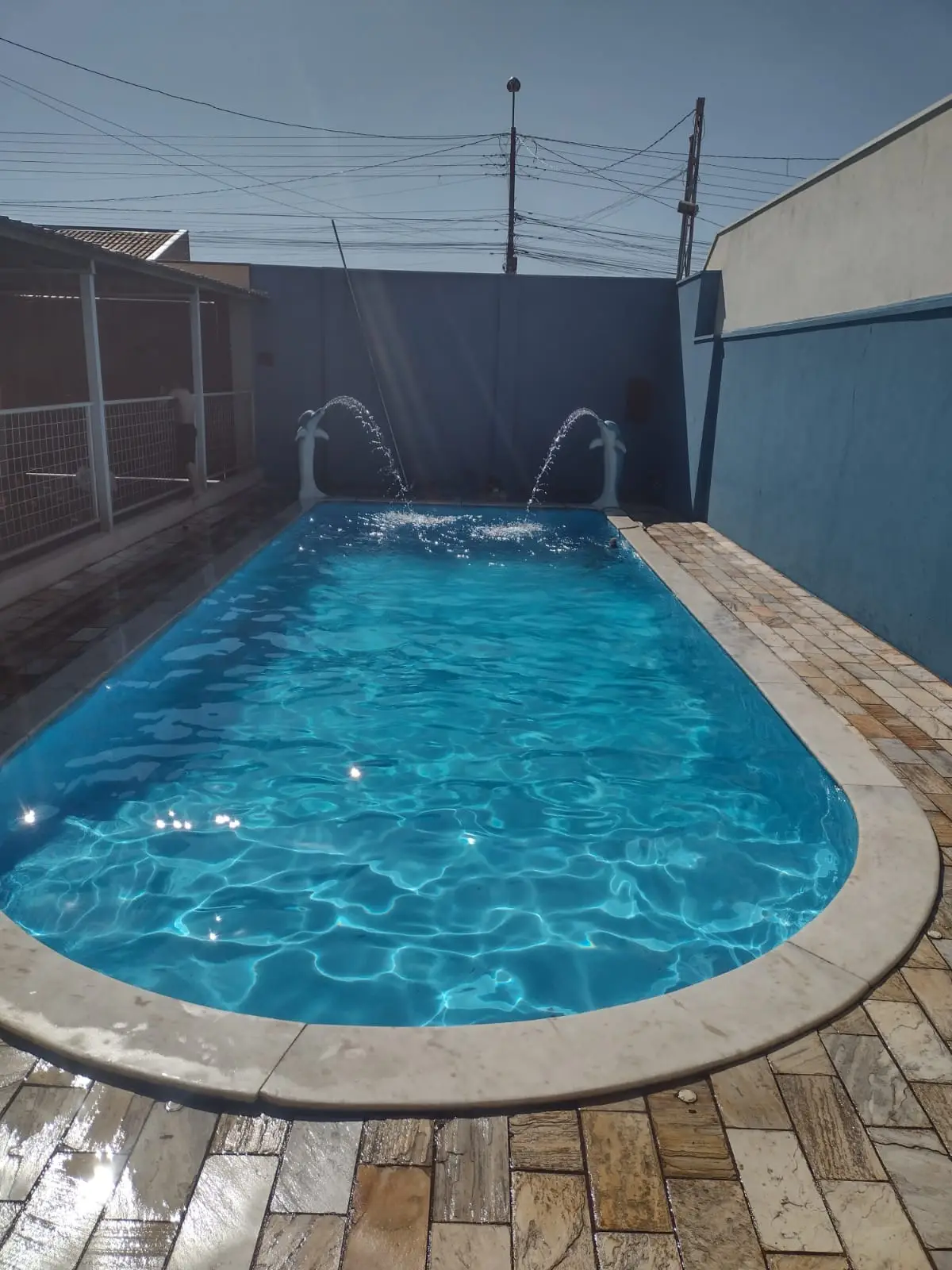 A Área de Lazer MR conta com uma linda piscina com chafariz em formato de golfinho, cercada para garantir a segurança das crianças 🐬💦.