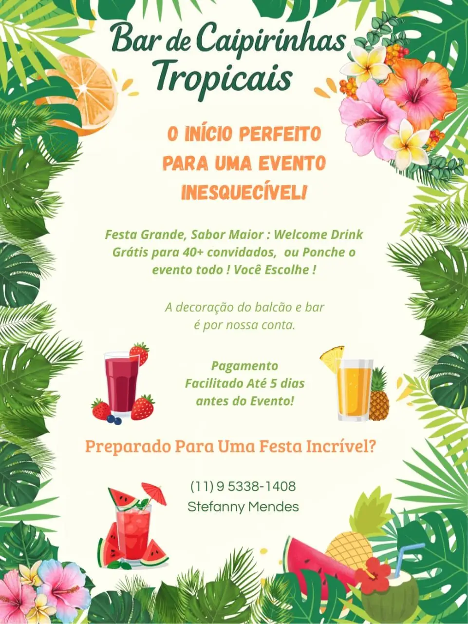 Com Stefanny Mendes, o Bar de Caipirinhas Tropicais leva os maiores sabores direto para sua festa, aniversário, confraternização ou evento em geral.