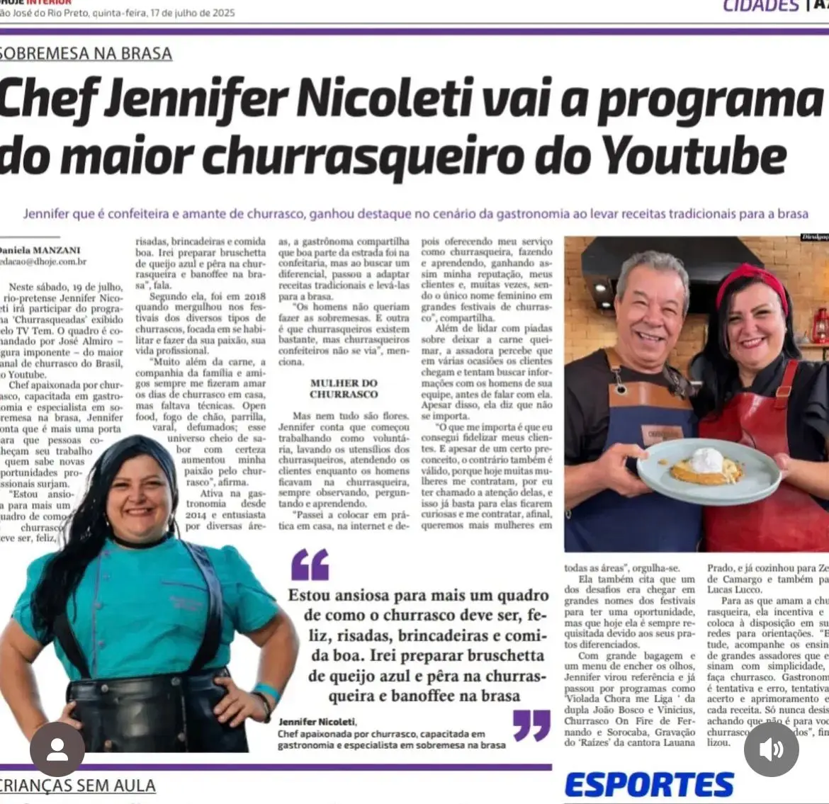 Além de dominar a culinária contemporânea, Jennifer é especialista em churrascos gourmet, trazendo cortes nobres, acompanhamentos