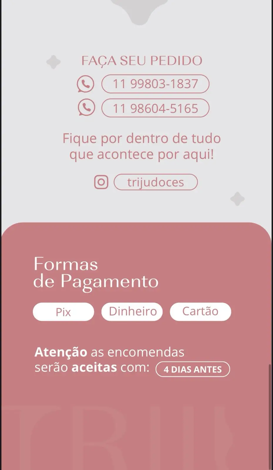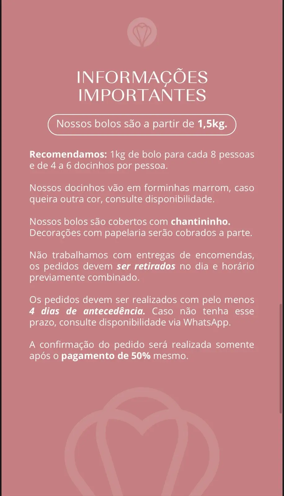 ⚠️ Os pedidos devem ser realizados pelo menos 4 dias de antecedência. Caso não tenha esse prazo consulte a disponibilidade no WhatsApp.